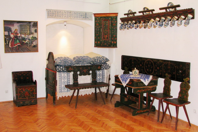 A hagyományos torockói szoba berendezése a következő: A szoba belső sarkában található a díszes, magasra vetett ágy az ágyfőtől valóval (az ágy fej felőli része, melyet magasabb deszkából készítettek) és a párnákkal. Az ágy mellett egy nagy gyontáros (festett) láda, a láda mellett pedig padláda található. Ez utóbbi hátsó támdeszkával és fedéllel van ellátva. Csak az egyik, a tűzhellyel ellentétes végén van karja. Az ablakos oldalon helyezkedik el a karos pad, a pad előtt pedig az asztal, mely talpas lábon áll elől összefogóval (az asztallábakat megerősíti, hogy ne menjenek szét vagy össze, illetve azon pihentethették a lábukat) és fiókja is van. A falon a ládák és a háttértám nélküli padok mögött találhatók a kivirágozott, gyontáros deszkák, a falravalók. A falravalók fölött van a fogas és tálas, erre porcelán-, üveg- és cseréptányérok, kancsók vannak aggatva. A fogas folytatásaként végigfut a fölephez (plafonhoz) erősített rúd, rajta a kihímzett, varrott rúdravalókkal. A falba kisebb-nagyobb, kétajtós, virágokkal kifestett szekrény, téka van beépítve. A tékával szemben levő sarokban található a kályha. Van néhány támlás, „kontyos” szék (ha békesség volt a házastársak között, akkor a székeket úgy tették, hogy a kontyok összenézzenek, ha pedig nem volt békesség, akkor megcserélték a székeket, hogy a kontyok ne nézzenek össze) és néha még egy második ágy vagy láda.