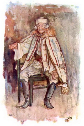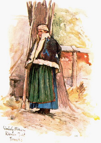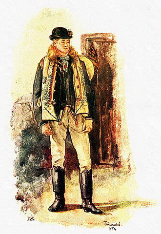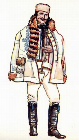 Nyáron széles, felhajtott karimájú, fekete kalapot, télen báránybőrből készült kucsmát hordtak. Az ingük fehér gyolcsból készült, a viselő korától függően leszorították különböző színű és díszítésű övvel. A nyakukba négyszögű fekete selyemkendőt tettek (a fiataloké ki volt hímezve, az idősebbeké dísztelen). Az ingre rávették a fehérített báránybőrből készült lájbit, mely ujjatlan, elől csukódó, rókaprémgalléros és kék fonallal levarrt. Erre a lájbira, nyakba akasztva rávették a vörös vagy kék selyemmel kihímzett rókaprémes bőrködmönt. Alsó ruhaneműként kétszer ványolt (tömött szövésű) gatyát viseltek, erre jött a fehér posztóból készült csizmanadrág, harisnya, oldalt zöld szegéllyel, elől vitézkötéssel díszítve. Lábbelijük a vassarkú, fekete kordovánbőrből készített csizma.