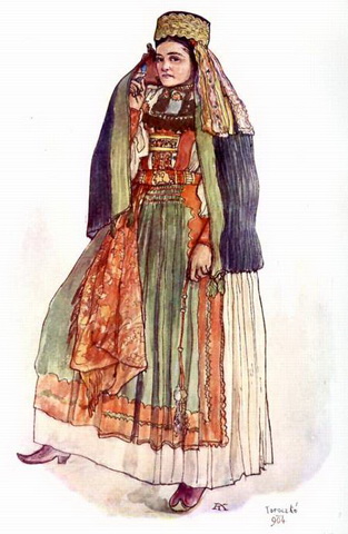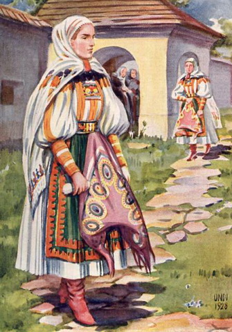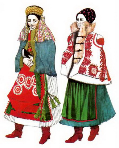 A lányok fejrevalója a fekete bársonyból készített, arany csipkével borított, három oldalról szalagokkal körülaggatott párta volt. A fiatal asszonyokán vékony selyemfátyol is volt, kihímezve kék, piros vagy zöld selyemszállal. Az asszonyok fekete keszkenőt vagy virágos kendőt hordtak. Az ingük fehér gyolcsból készült, az eleje sűrűn ráncolt és mintázott, az ujja hosszú és hímzéssel díszített. Az ing felett a nyakban szélesen elterülő csipkés fodrot viseltek. Az ing kiegészítője a fehér gyolcsból készült vállas szoknya, másnéven fersing. Erre jött felül, keresztben a színesen hímzett fűző és hosszú kézelők, melyeket az ingujjra kapcsoltak. Az ingre hétköznap fekete lájbit vagy ujjast vettek, ünnepnapokon pedig báránybőrrel bélelt mellényt. Az öltözet díszes kiegészítői a következők voltak: zsinóröv, jegykendő, erszény, átlósan hajtott selyemkendő. Lábbelijük a hegyes orrú, magas sarkú piros (lányoké) vagy fekete (asszonyoké) színű harmonikás szárú csizma.