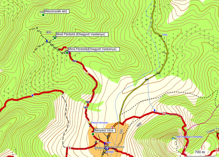 A Bagoly-hegy oldalában lévő régi bányák – Mészárszék tető (930 m)A Bányász utca mentén hagyjuk el a falut észak irányába. Sárga háromszög jelzi utunkat. A jelzés tulajdonképpen a régi bányáktól lejövő hajdani széles szekérutat követi, mely ma helyenként nagyon jó állapotban van, máshol vízmosások tették nehezebben járhatóvá.